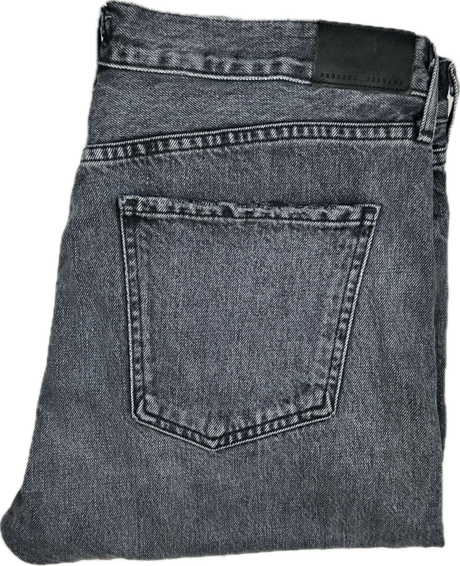 Black Vintage Washed Rigid Denim. Classic 5 Pocket.Button Fly. High Rise. Slim Straight Cigarette Leg. Ankle Grazer. Factory Whiskers/Fades. RRP When New $500+