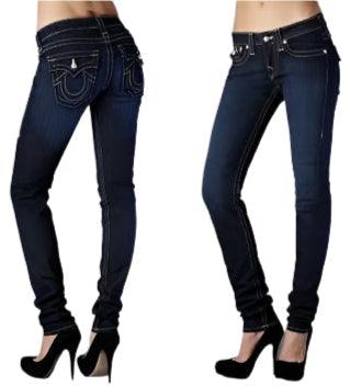 Dark Vintage Wash Stretch Denim. Classic 5 Pocket. Skinny Tapered Leg. Low Rise. Silver Hardware. Iconic Back Flap top Pockets with Jewelled Crystal Buttons. White Contrast Topstitching. Factory Whiskers/Fades. When Brand New RRP around $325 AUD