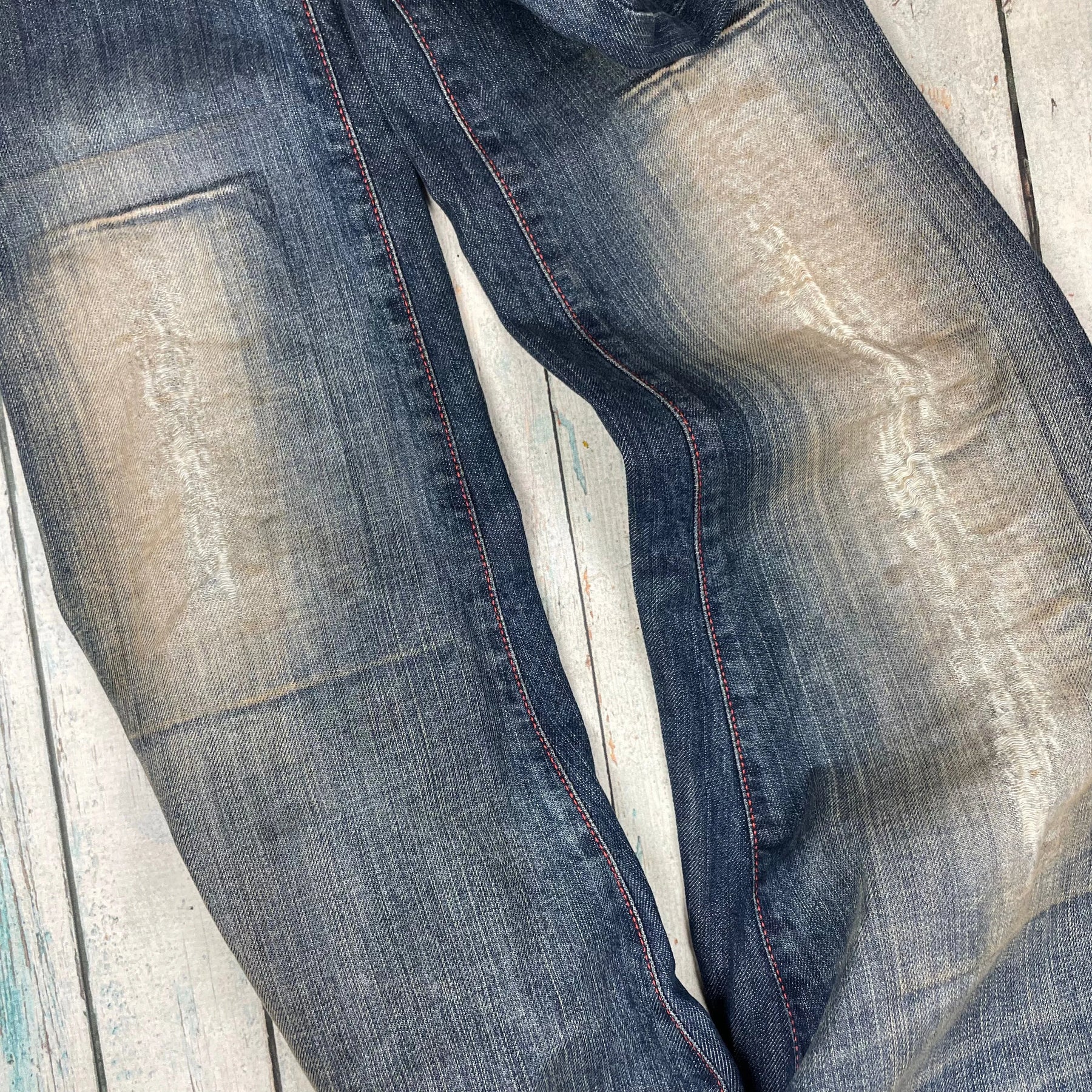 Blue Vintage Distressed Wash. Rigid Denim.  Straight Tapered Leg. Low Rise. Rhinestones. Crystal Details on back waist label and front fly.  Pocket embroidery and Metal Rhinestones. Long leg. Whiskers/Fades/Repairs.