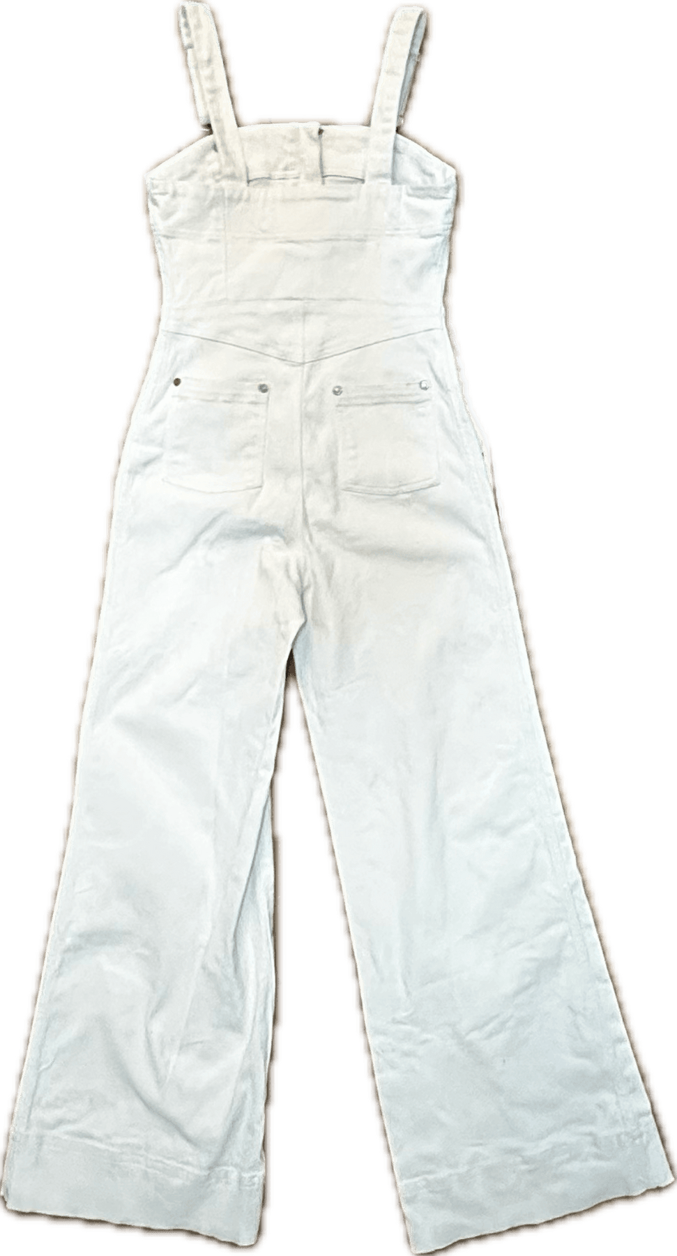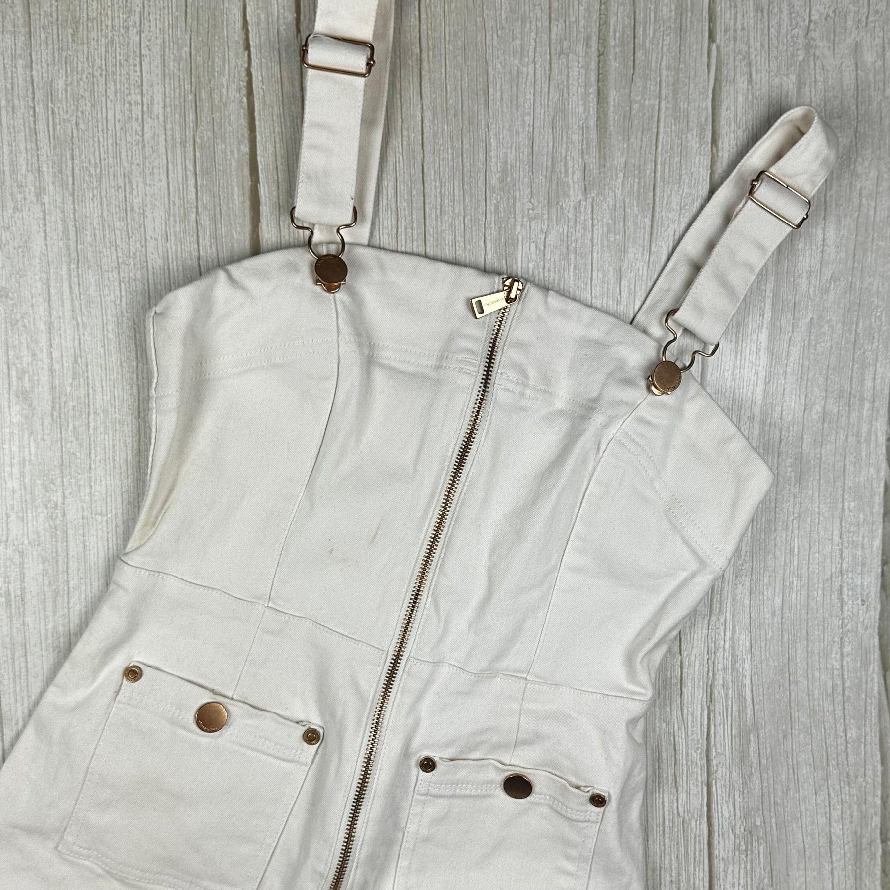 Off White Stretch Denim. Shaped Corset Styled Fitted Bodice. Full Front Zip.  Long Wide Flare leg. Adjustable Bib and Brace Front. 2 Button sides. Gold Logo Buttons, Rivets, and Zipper Pull. Patch Pockets. RRP $320 When New