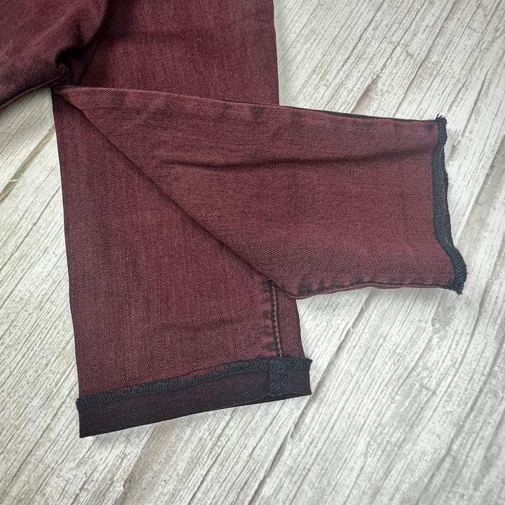 Burgundy Red/Black Garment Dyed Finish. Classic 5 Pocket. Skinny Tapered leg. Raw Rolled Hems