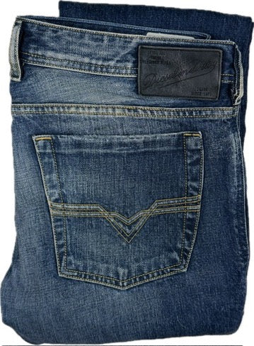 Blue 008FA Wash Rigid Denim. Straight Bootleg Cut. Low Rise. Classic 5 Pocket. Button Fly. Diesel Coin and Back Waist Branding