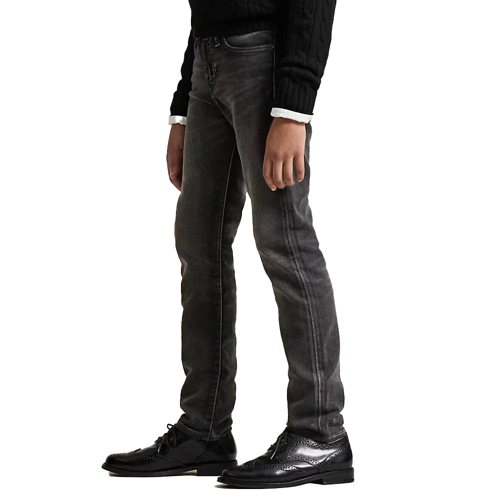 Washed Distressed Rigid Black Denim. 5 pocket. Slim Skinny Leg. Distressed Features. Zip Fly. Factory Whiskers/Fades. Distressing/Aged look is a  feature of these jeans. Cropped Leg Length
