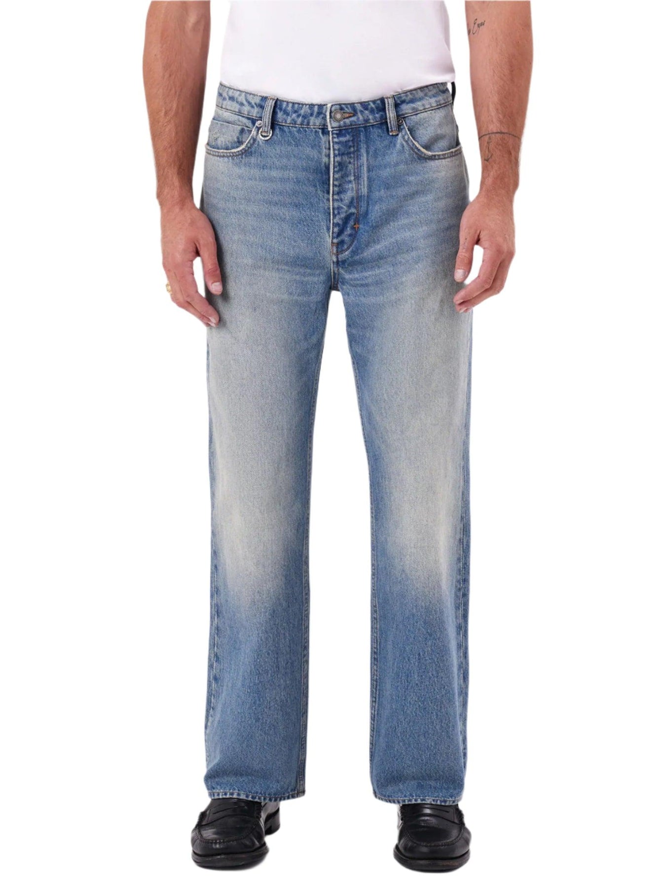 Blue Mid Vintage Indigo Distressed Mid Blue 'Elysian' Wash Denim. 5 Pocket. Relaxed Straight leg. Button Fly. Contrast Topstitching. Gunmetal Hardware. Factory Whiskers/Fades. Loads of Details.