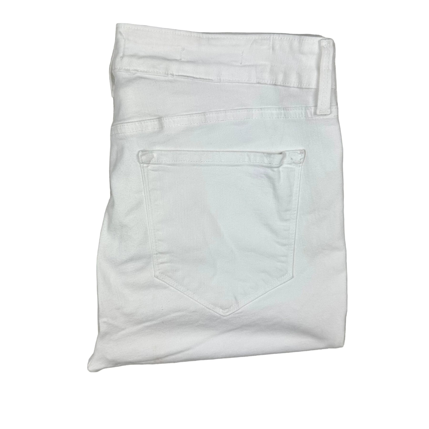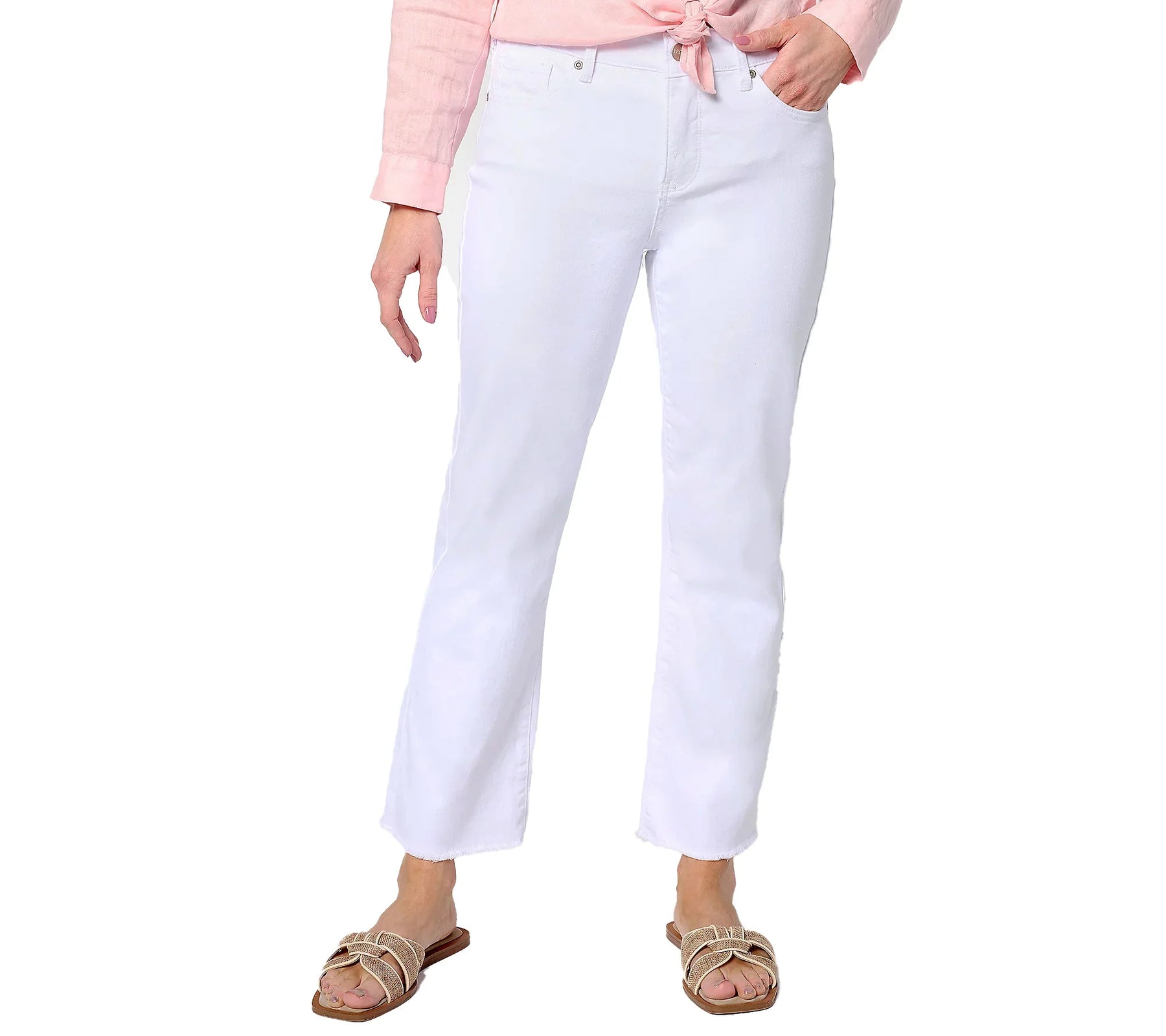 White Stretch Denim. Lift and Tuck Technology. Stretchy. Straight Leg. Classic 5 Pocket. Mid Rise. Raw Hems. Ankle Grazer. Look a While Size Smaller.
