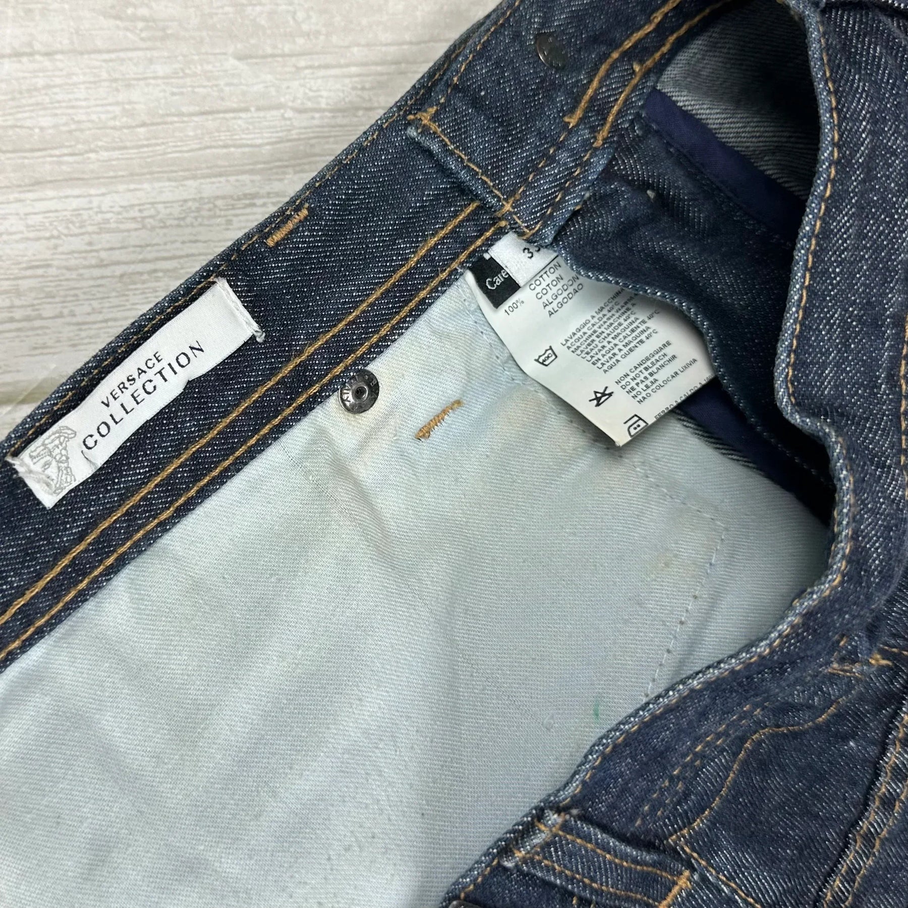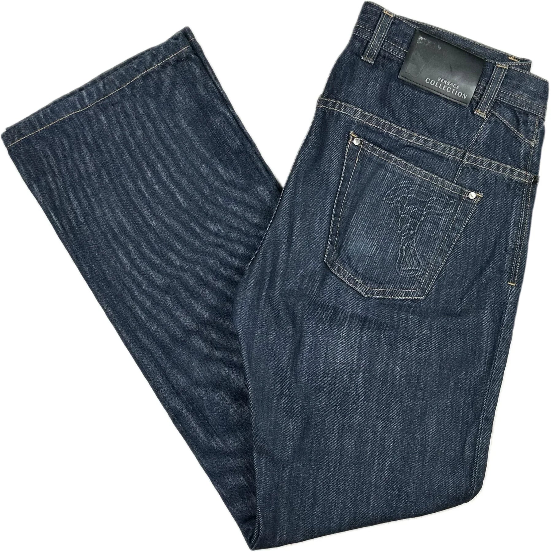 Dark washed denim. Classic fit. Straight Leg. Contrast Top Stitching. Zip Fly. Embroidered V pockets. Versace Collection waist label ( Some Belt rub see pics).  Versace Medusa Head Embroidered Logo Pocket