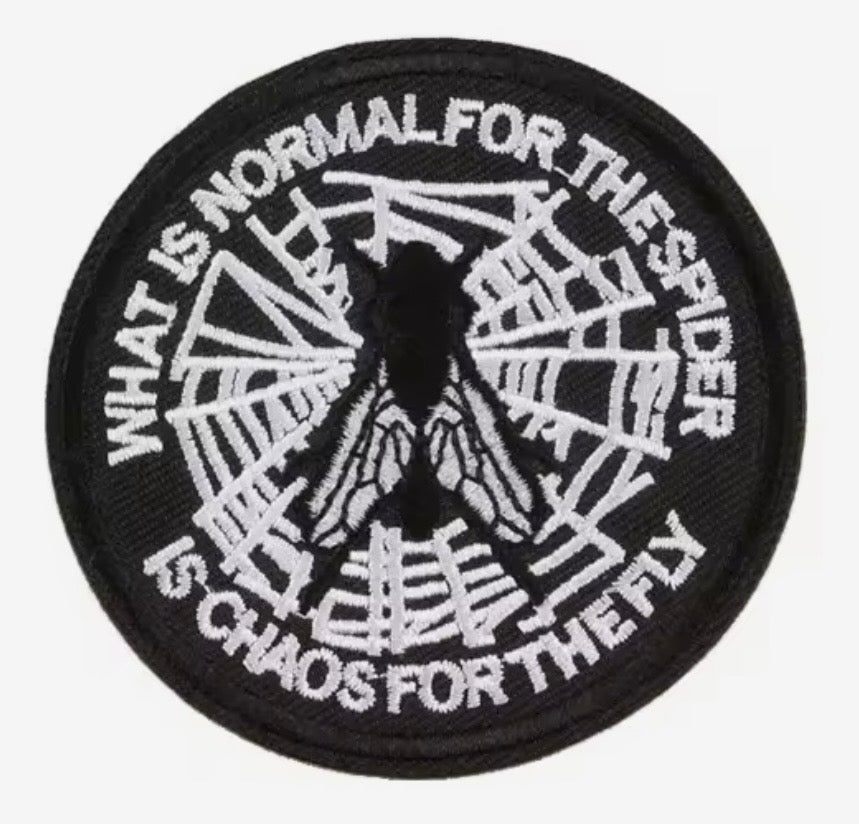 Whats Normal to The Spider is Chaos for the Fly - Round Design. Iron on Patch. Round 8cms