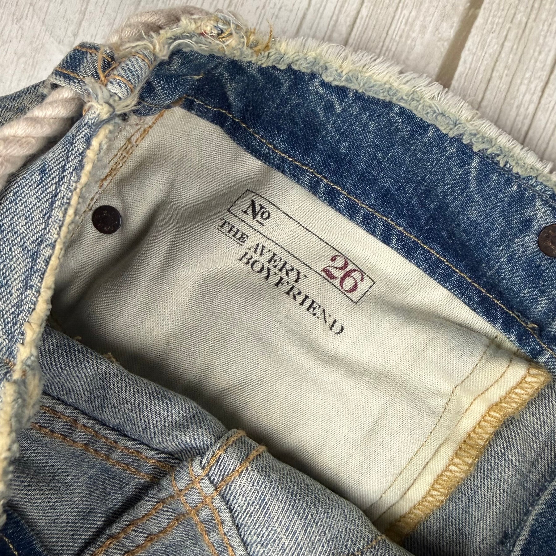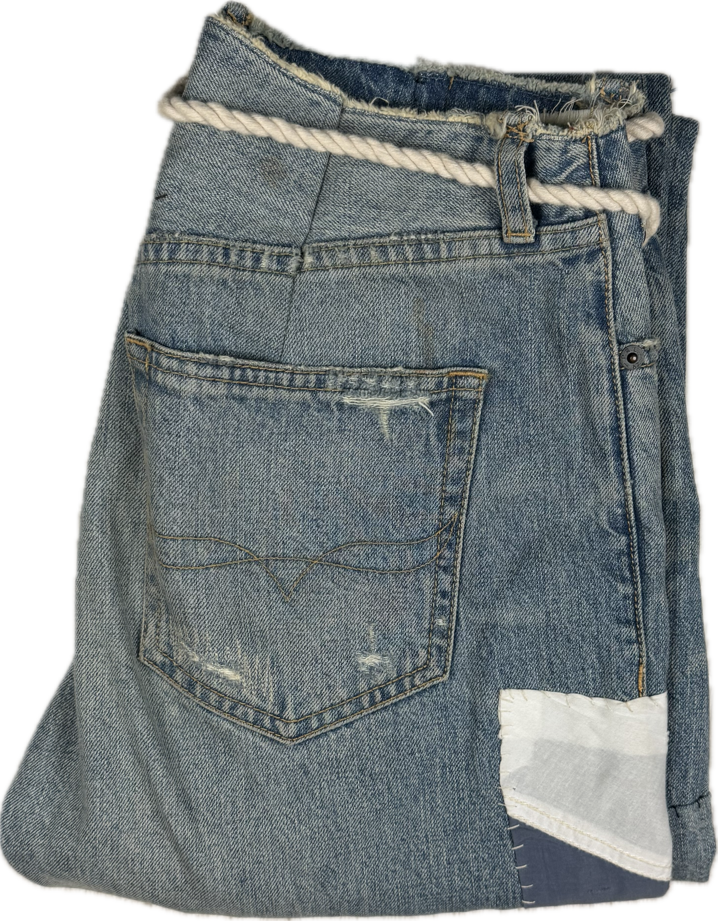 Soft Rope Dyed Denim. Classic 5 pocket. Boyfriend Easy Fit. Tapered Leg. Mid Rise. Zip Fly. Ankle Grazer. Factory Fades/Whiskers/Patches/Frays. Removable Rope Belt. When new RRP $549.00