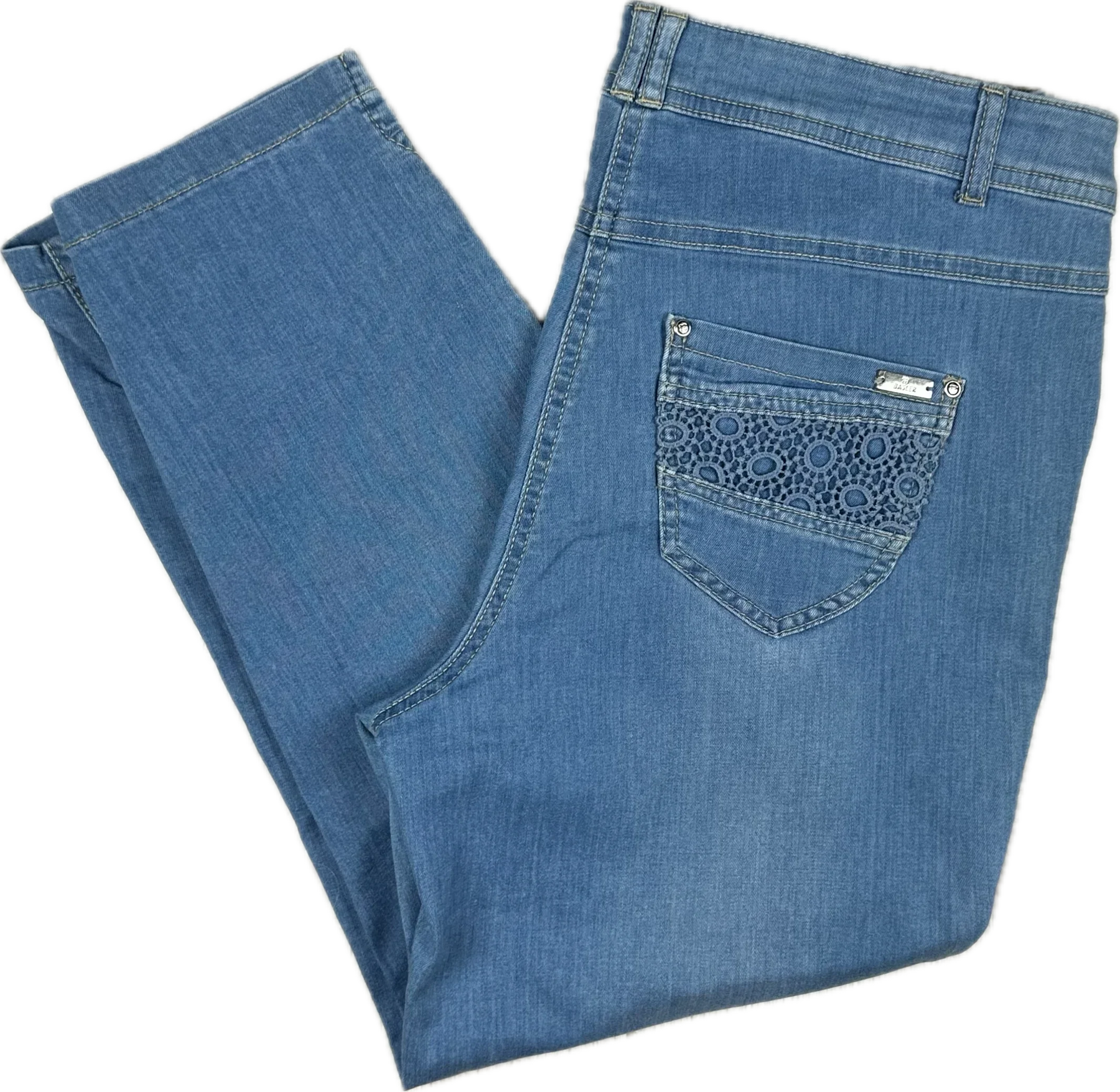 Blue Light Wash Stretch Denim. Classic 5 Pocket. Mid Rise. Slim Straight Crop Leg. Lace inserts at Pockets. Logo Rivets.