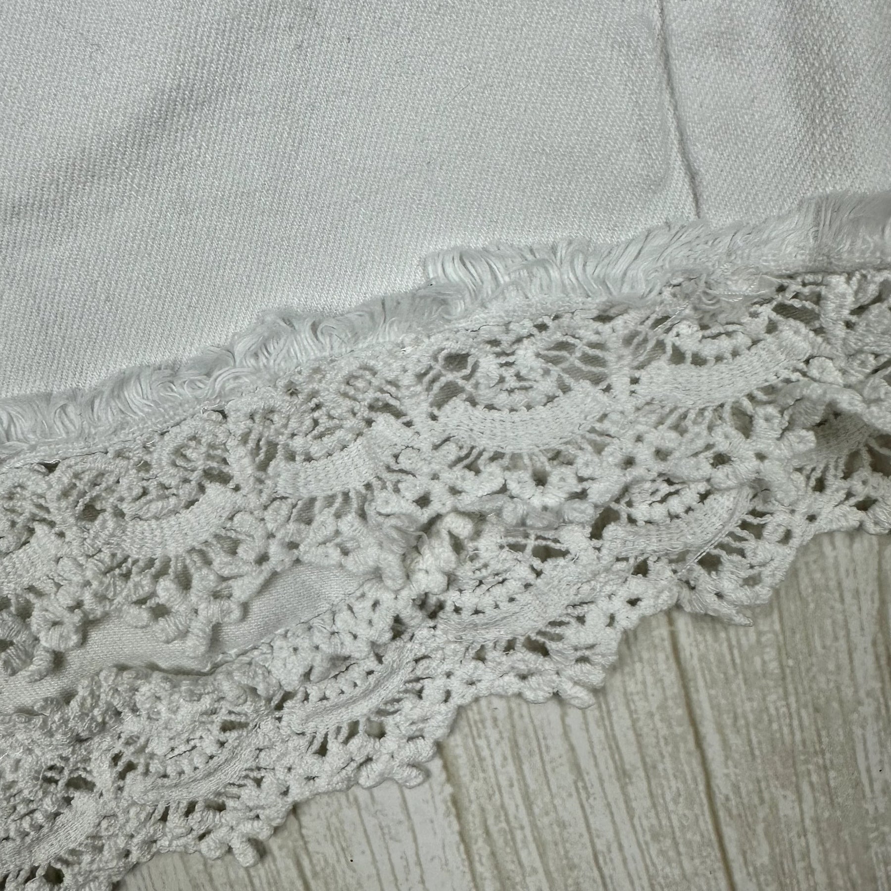 White Stretch Denim. Classic 5 Pocket. Zip Fly. Low Rise. Raw Hems with Cotton Lace.