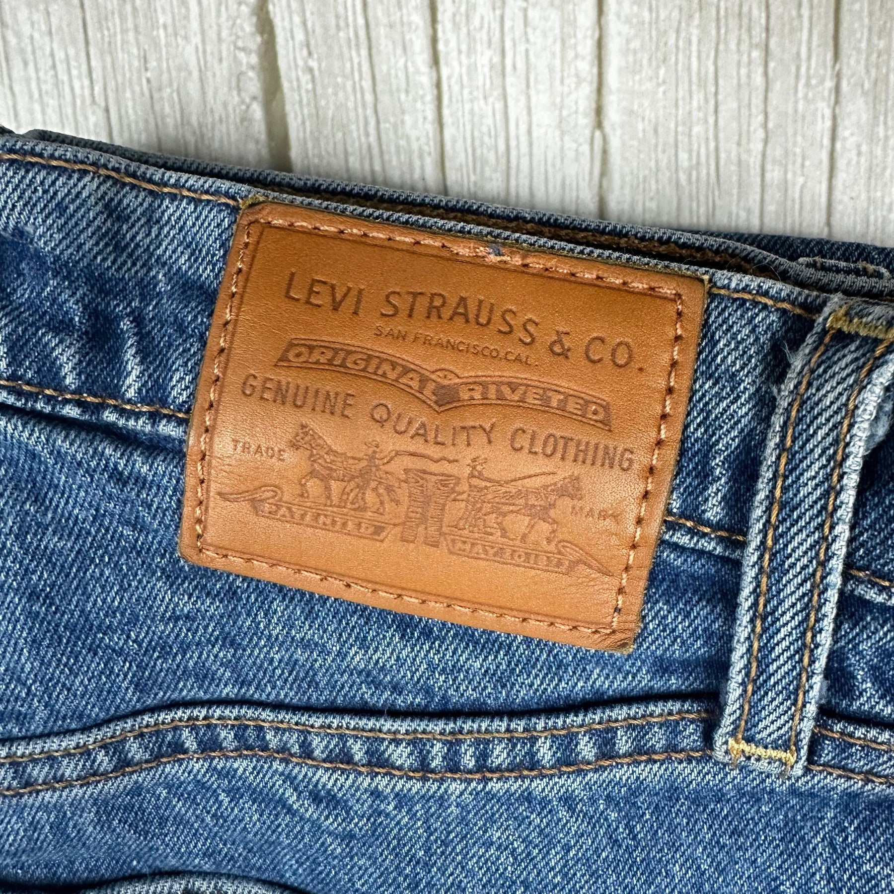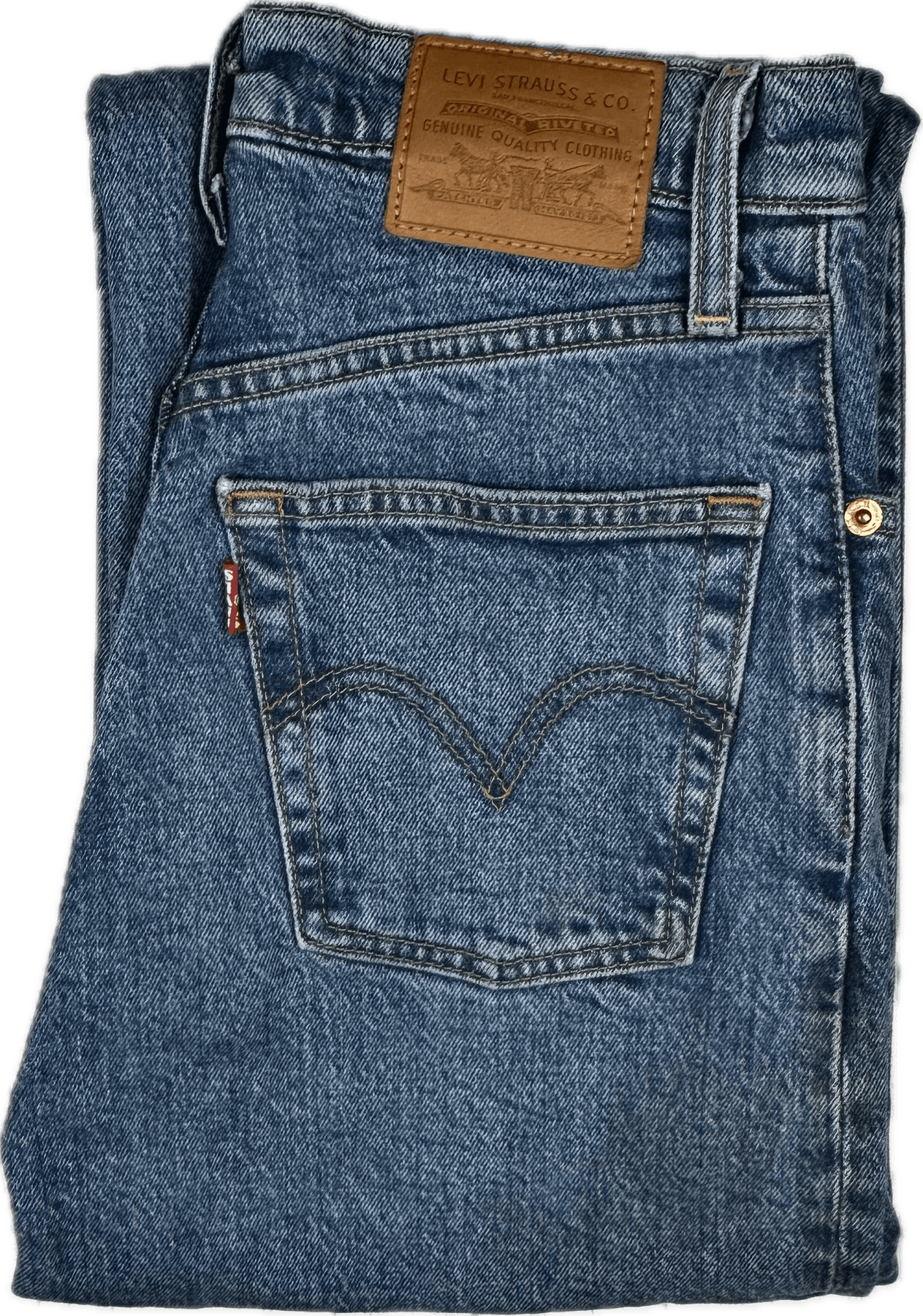 Blue Vintage Washed Stretch Denim. Classic 5 pocket. Copper Rivets. Button Fly. Contrast Topstitching. Red Label. High Rise.