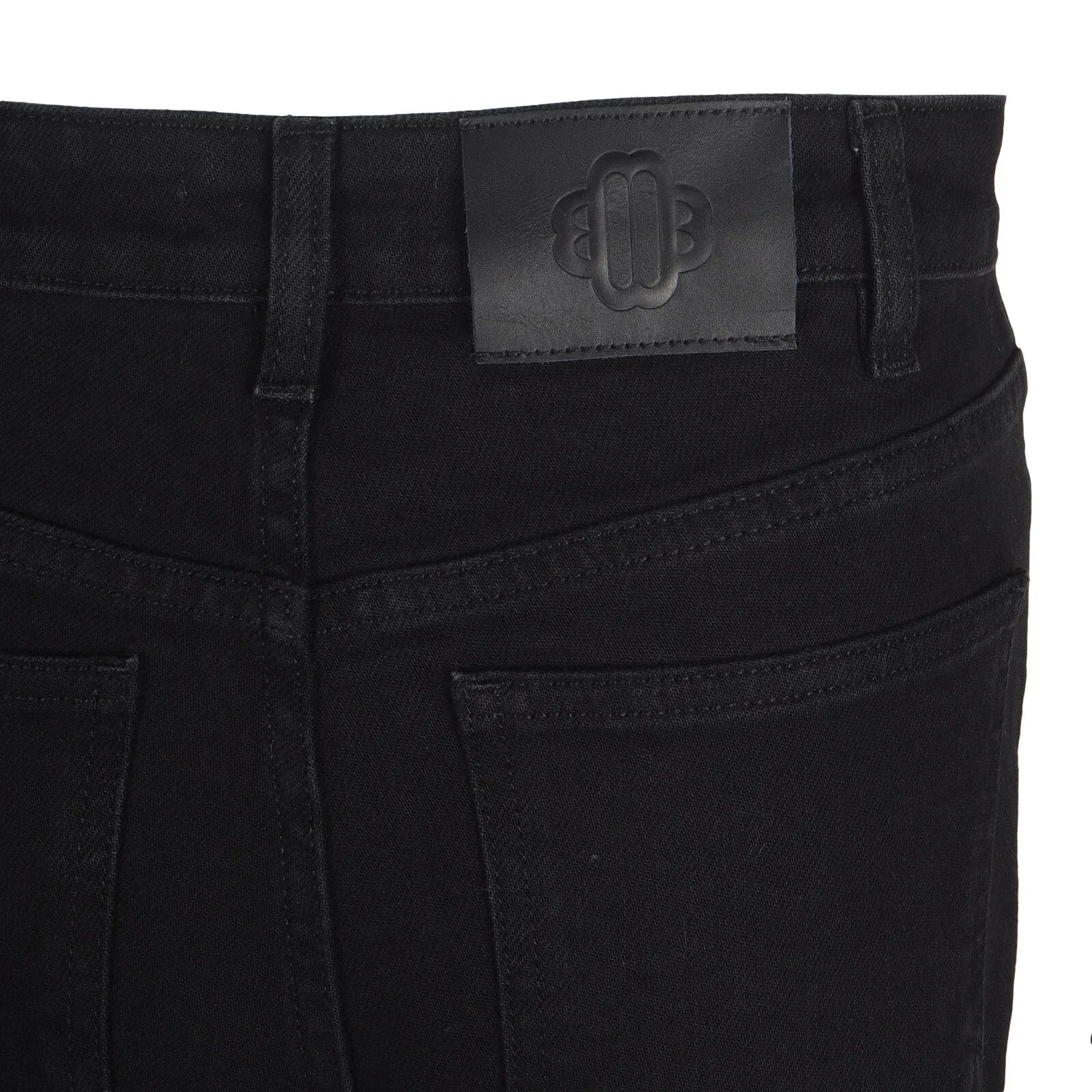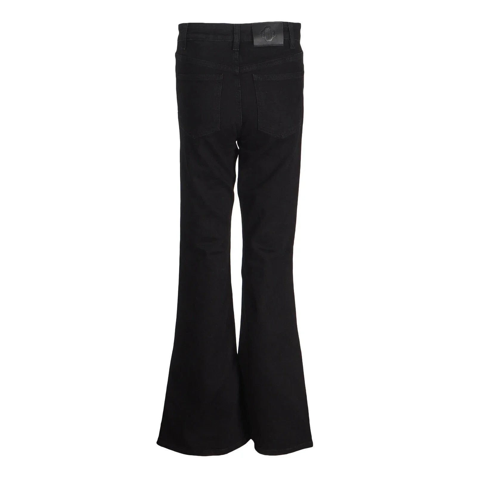 Black Stretch Cotton Blend Denim. Classic 5 Pocket style with Exposed from Zipper. High Rise. straight Leg with Flare Hems.