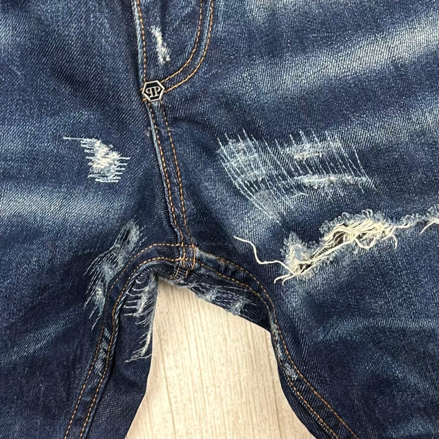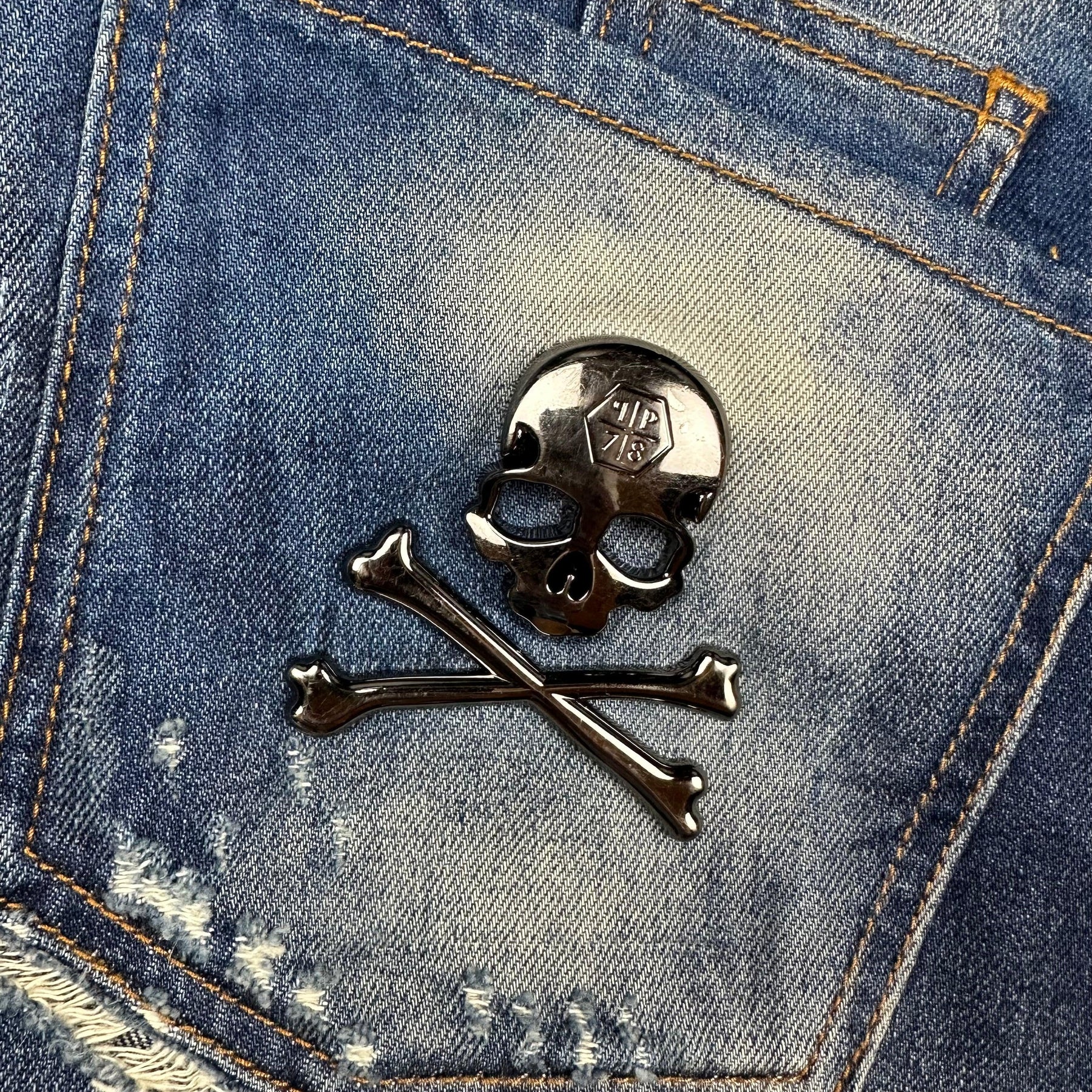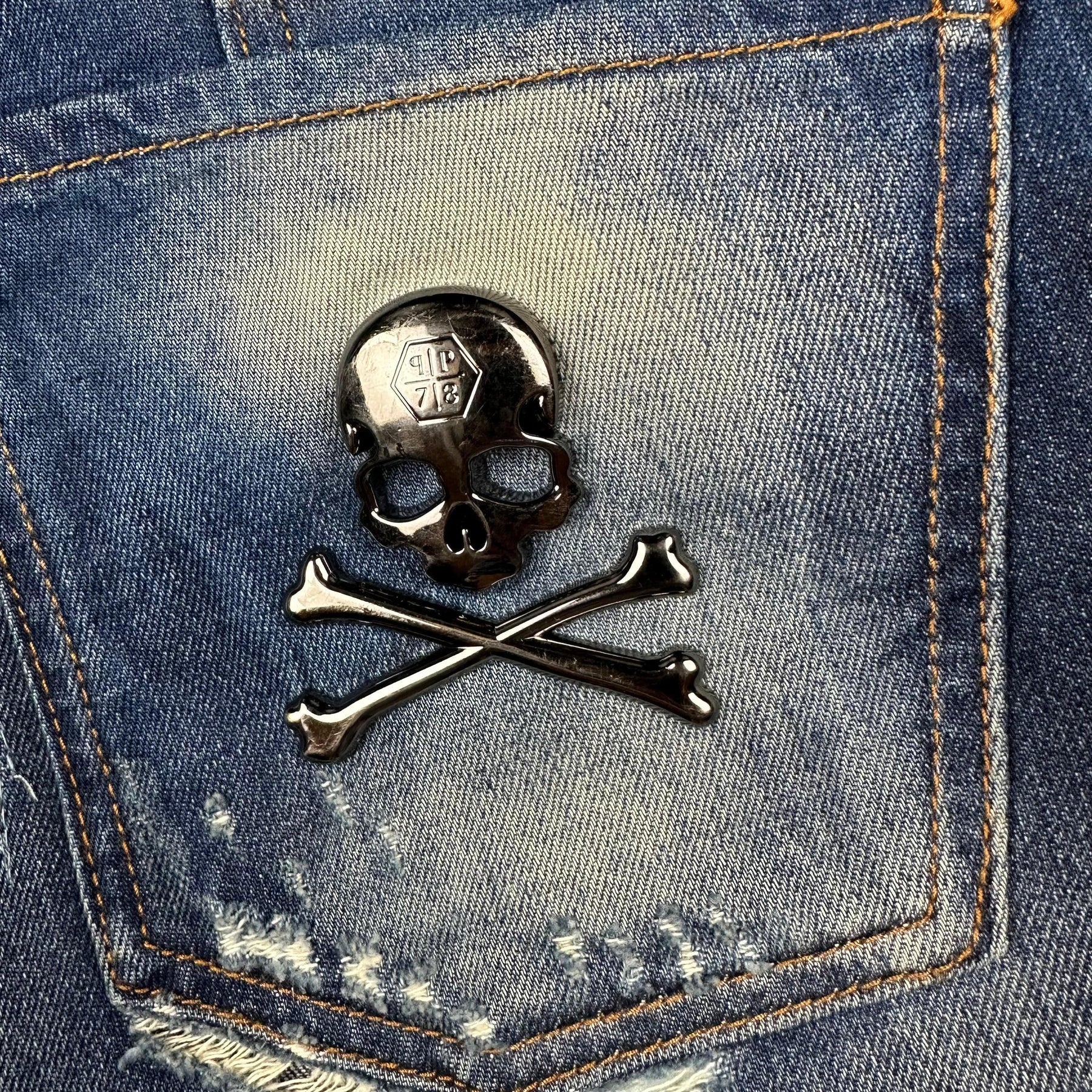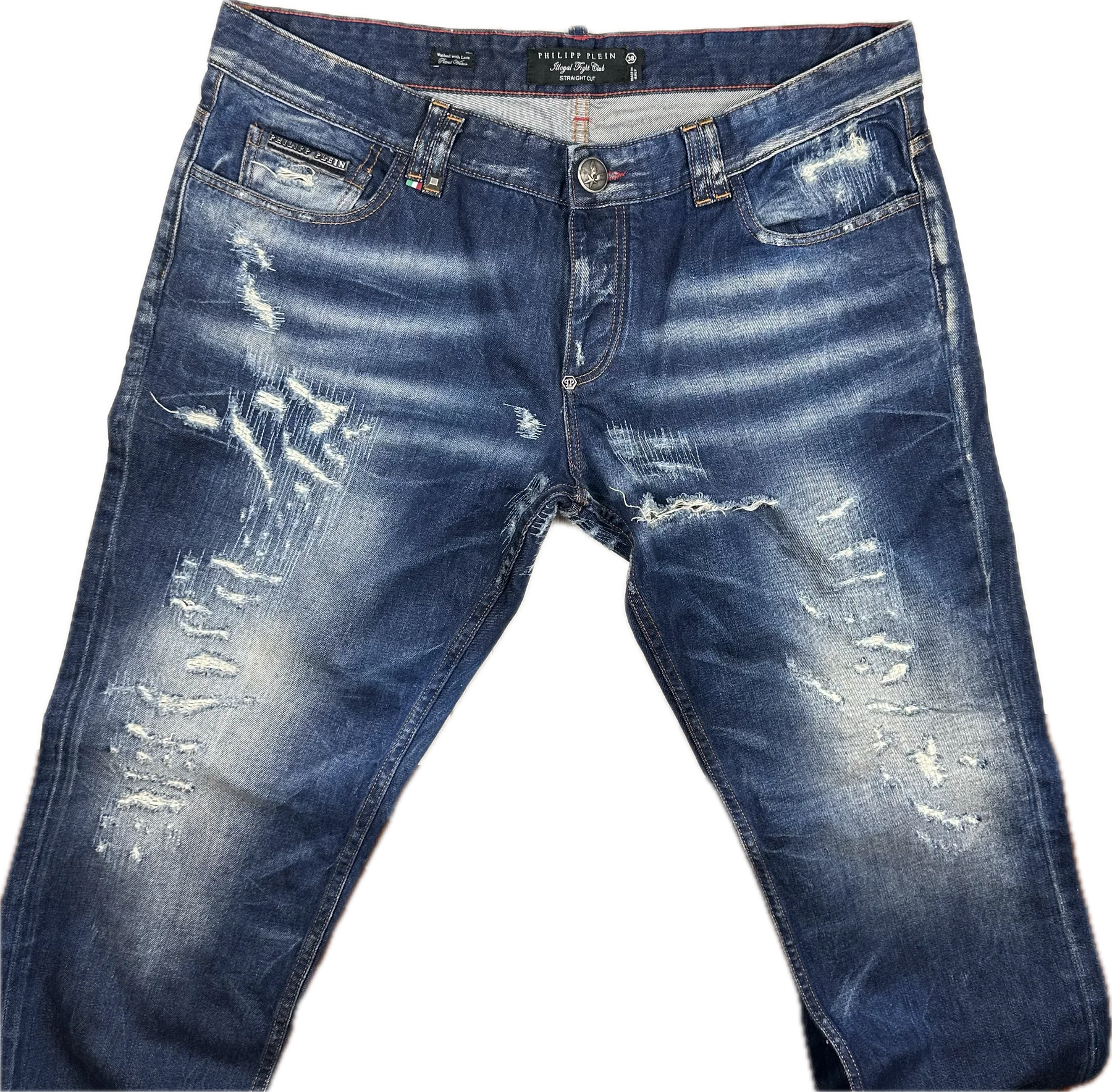 Blue Distress Washed Stretch Denim. Straight leg.  Distressed Aged  Look. Classic 5 Pocket. Low Rise. Button Fly.  Philipp Plein Front Coin Pocket Plaque Logo. Back pocket Large Gunmetal Skull & Crossbones Feature Logo Fly Rivet. Factory Whiskers/Fades/Rips/Repairs. Loads of Features.
