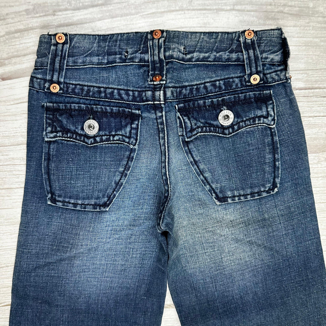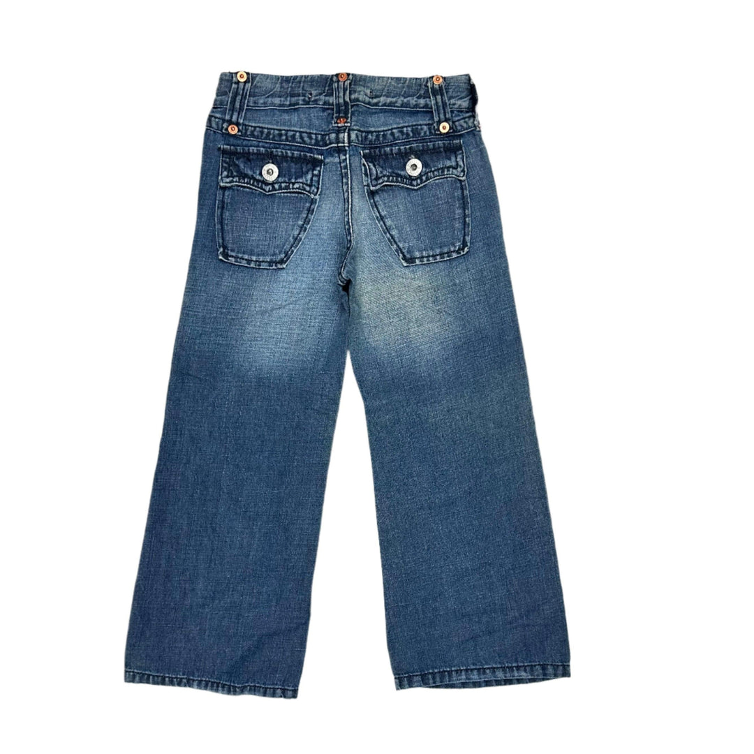 Dark Blue Denim. Slight Elastic Back Waist. Flap Top Back Pockets. Wide Straight Leg. Relaxed Fit. Copper Rivets. Factory Whiskers/Fades.Inner Seam - 19" Rise - 6.5" Waist Lying Flat - 10.5"