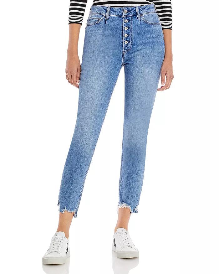 Blue Vintage extra Soft 'Darcene Distressed Hem' Wash. Classic 5 Pocket. Straight Slim leg. Exposed Button Fly. High Rise. Factory Whiskers/Fades/Chewed Hems. Ankle Grazer.