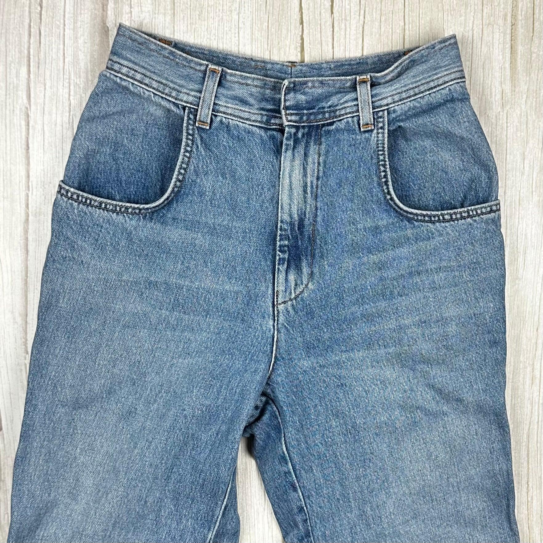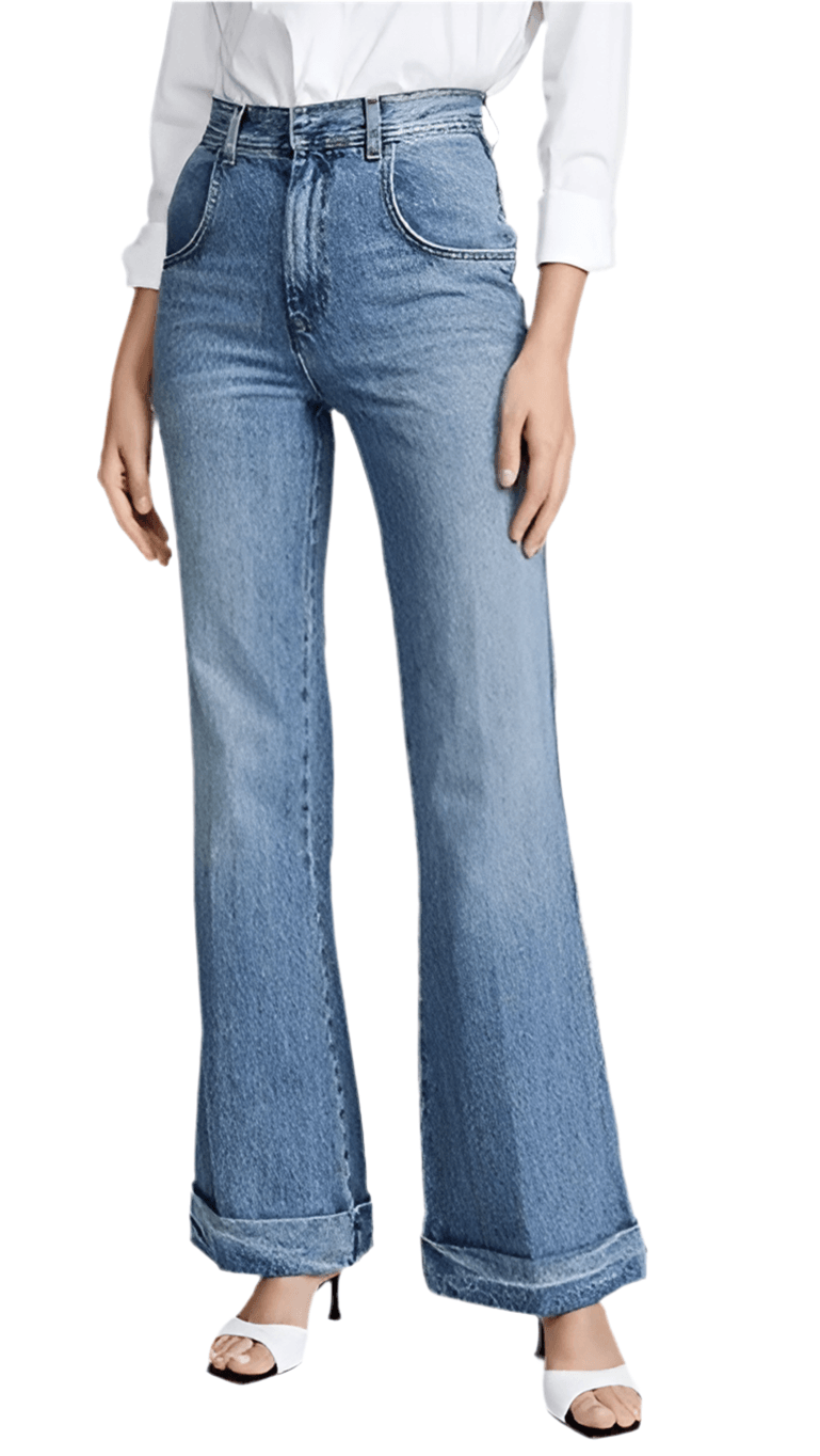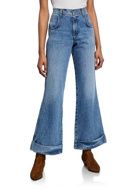 Blue Mid Wash Aged look Distressed Denim. Ultra High Rise. Straight Leg with Cuffed Bell Bottom Flare From knee. Classic 5 Pocket. Button Fly. Contrast Stitching. White Leather Re-Done Label at back waist. Stitched Cuffed Hems. Factory Whiskers/Fades/Frays. RRP New $550+