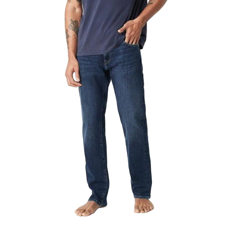 Blue Mid Brushed DarkWash Denim. Straight Leg. Whiskers/Fades. Zip Fly. Leather Back Label.