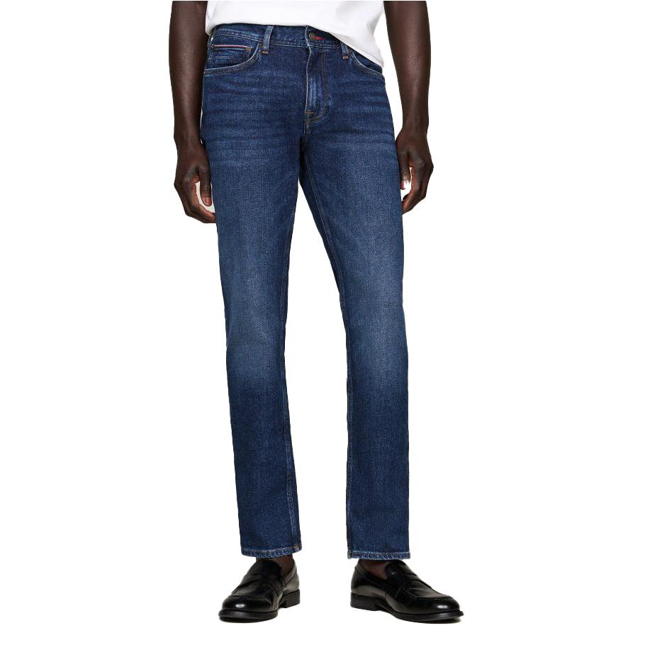 Mid weight Vintage Wash Stretch Denim. 5 pocket. Classic Fit. Straight Leg. Tommy Flag Logo. Zip fly. Aged Vintage Look. Whiskers/Fades/Frays.