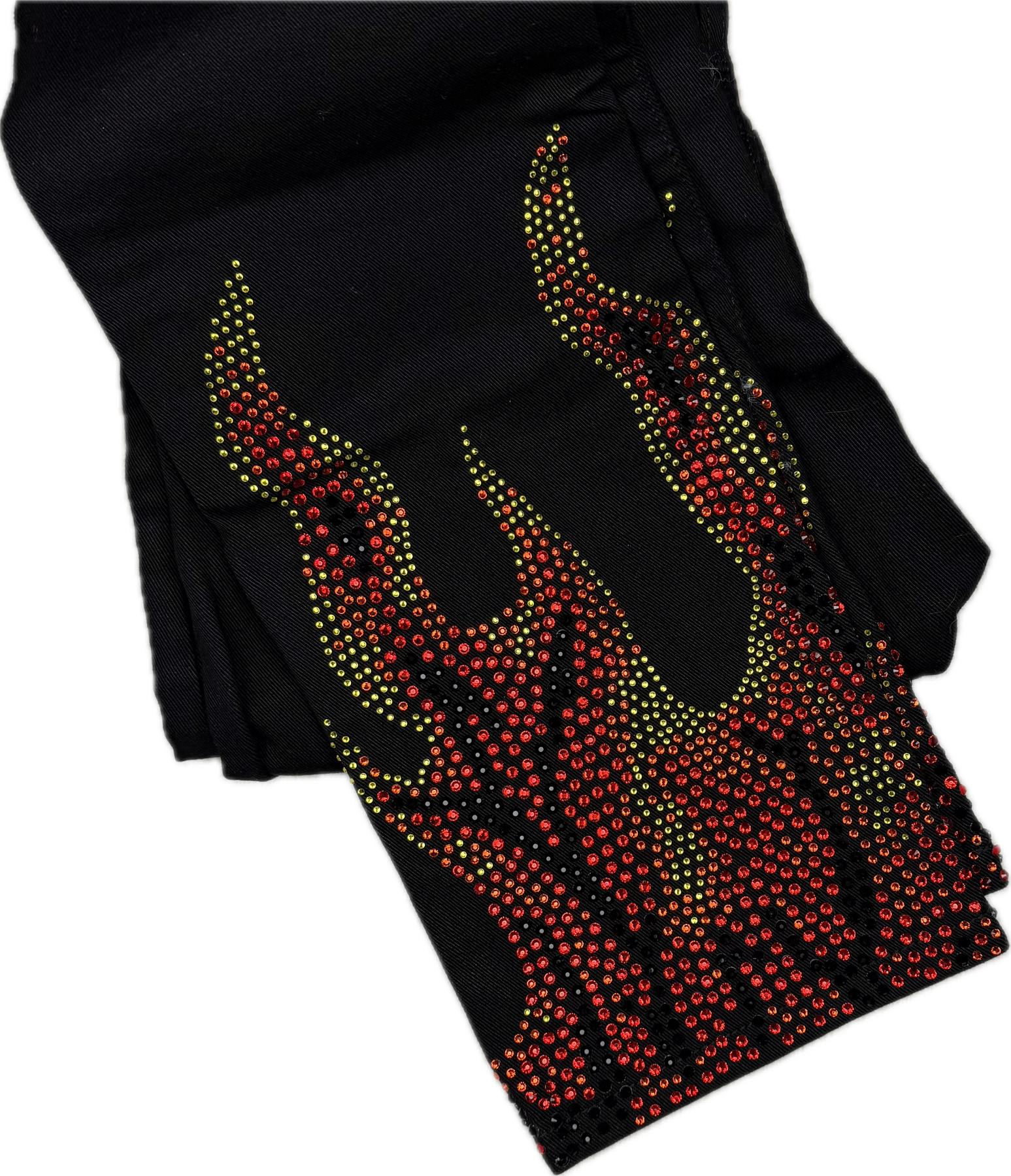 Black Stretch Denim. High Rise. Straight Leg 5 pocket Classic Cut. Stunning Crystal Flame design at hems. Leather back waist label and Metal logo plate branding. Hard to find High end Label. Ankle Grazer Style- show off the fabulous hem detail.