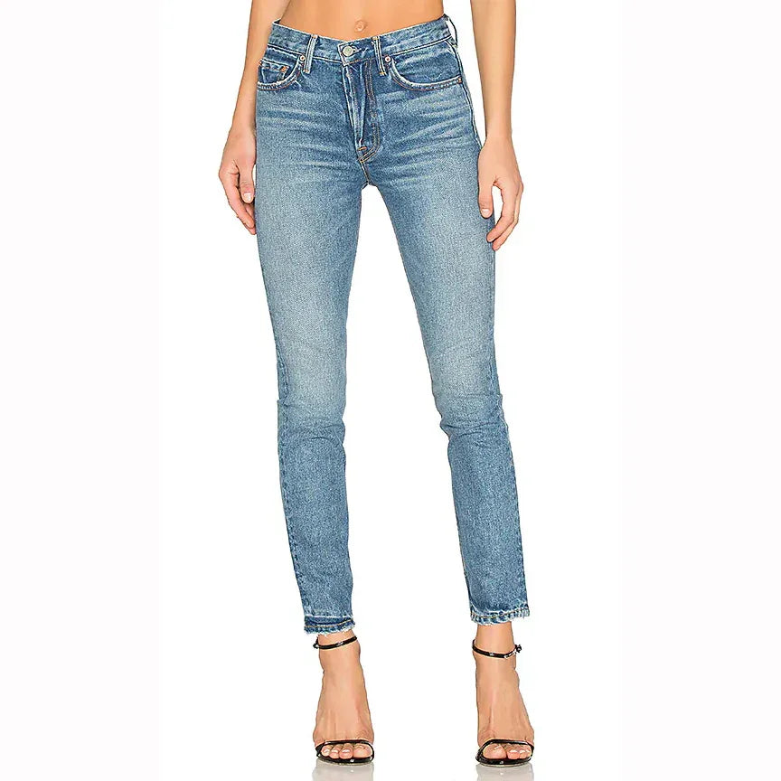 Washed Blue Distressed 'Green Eyed Lady' Rigid denim. High Rise. Slim Slight Taper. 5 pocket. Button Fly, Ankle Grazer Crop. Factory Whiskers/Fades/Frays. When New RRP $386.00