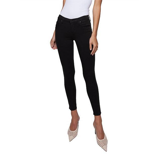 Power Black Stretch Denim. 5 pocket. Tapered Skinny Leg. Black Hardware. Mid Rise. Ankle Grazer