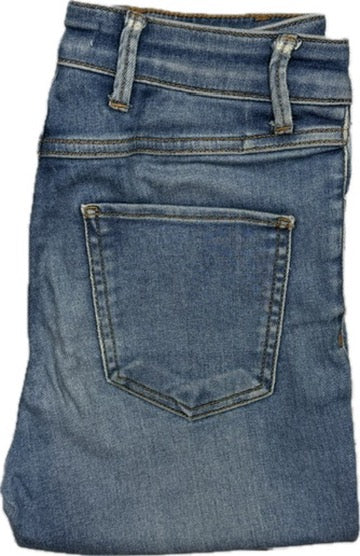 Blue Washed Denim. High Rise. Classic 5 Pocket. Slim Straight Cigarette Leg. Released Raw Hems. Ankle Grazer